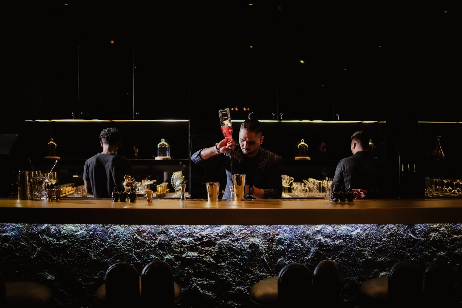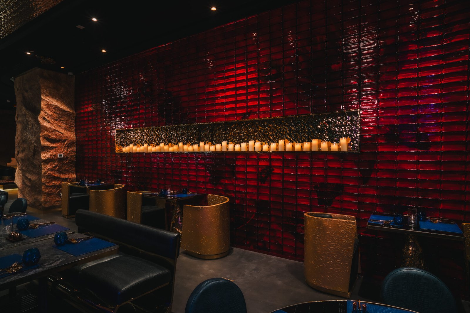 Subtle theatrical elements, live music, and sensory details elevate the dining room into an immersive experience rather than just a setting.